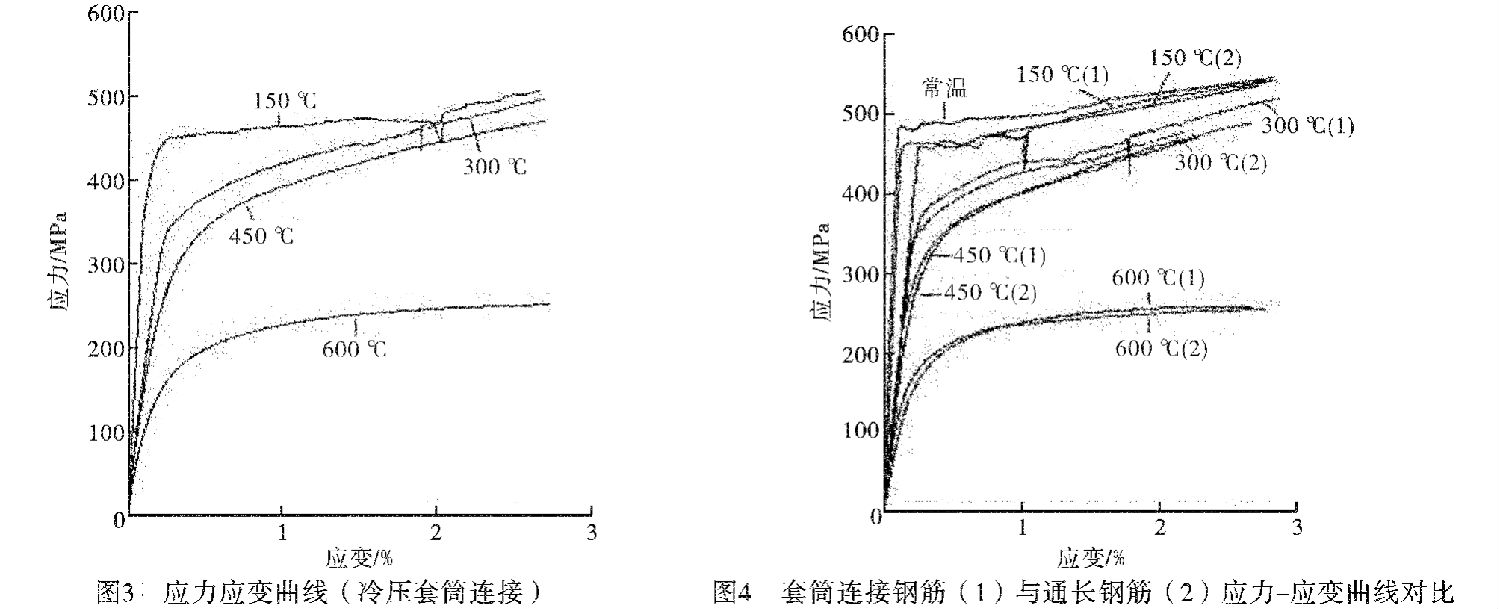 通過處理實驗數據,得到了高溫下采用不同套筒連接的鋼筋的應力-應變曲線,如圖2、圖3所示。并且與通長鋼筋在高溫及常溫下的應力-應變曲線作對比(圖4),可以看出采用套筒連接的鋼筋與無連接形式的鋼筋的應力-應變曲線幾乎是吻合的,可以認為鋼筋在高溫下采用套筒連接對其應力-應變曲線影響較小。