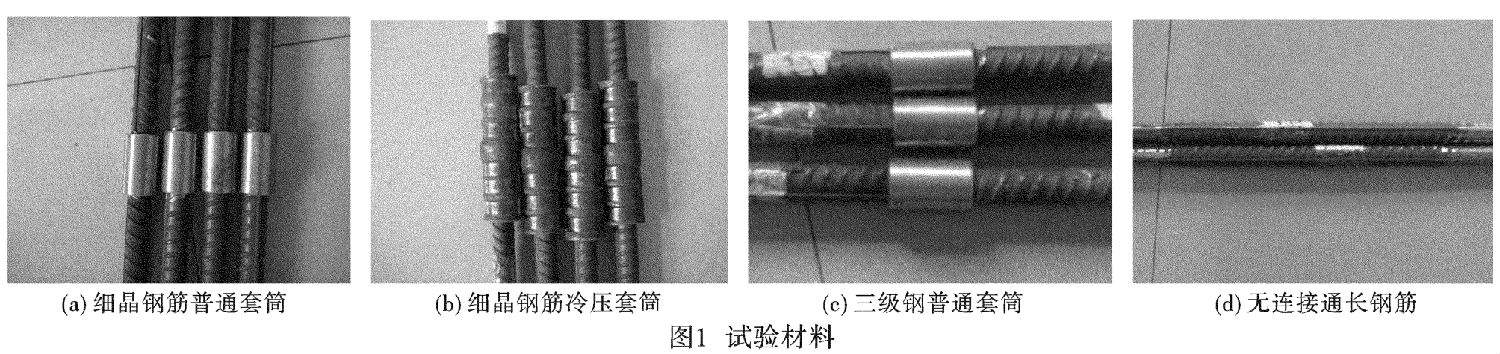 采用的鋼筋連接套筒由中國建筑科學研究院建碩股份有限公司設計并提供,選用兩種不同類別的鋼筋連接套筒接頭——普通套筒與冷壓套筒,套筒均按三級鋼做成。試件分3組,共11根,其中4根為細晶鋼筋普通套筒連接、4根為細晶鋼筋冷壓套筒連接、3根為普通三級鋼普通套筒連接,如圖1所示。鋼筋直徑都為20mm。