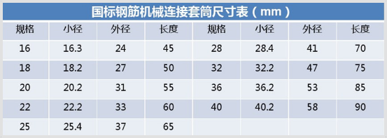 - 1、采用45號優質碳素結構鋼材的鋼筋套筒,設計合理,工藝先進,尺寸精度高,連接質量可靠。 2、各規格鋼筋套筒的基本參數,全部按照HRB400級鋼筋的強度要求進行結構設計,對HRB335、HRB400級鋼盤均可適用。 3、性能指標經“國家建筑工程質量監督檢驗中心”檢測,均達JG/T 163-2013中“I”級接頭的要求。