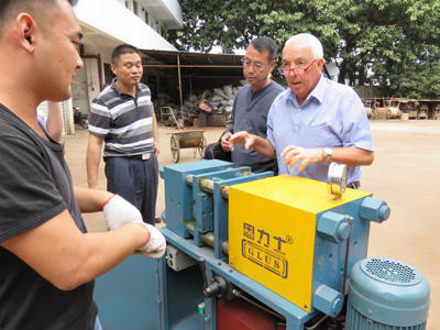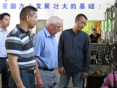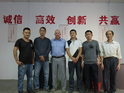 我們首先陪同凱文一行參觀了我們的新工廠。該工廠采用了全新套筒加工工藝。保證套筒絲牙精度達到6H級。套筒內徑、外徑、長度等指標也全部達到國家最新JG/T163-2013鋼筋連接套筒標準。是廣東省內少數幾家能達到此標準的生產企業。其間,凱文和黎生拿起我們生產的直螺紋套筒,不時點點頭。用英語交流了起來。凱文是英國最早從事鋼筋套筒行業的少數人之一。其在英國推廣的鋼筋籠技術一直使用至今。到今天入行年限已超過40年。真可謂一生只做一件事的典范。其行事風格極其嚴謹,是最典型的英國技術人才。嚴謹、負責是其身上最突出的特點。而黎生作為我們較早合作的外商之一,精通四種語言,以其鮮明的國際化令我們十分欽佩。